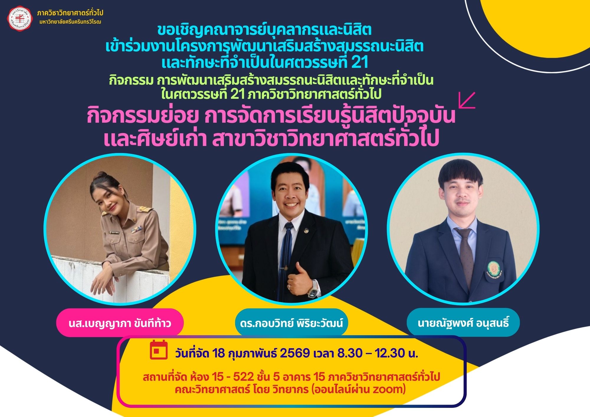 Gensci / Friday, February 13, 2026 / Categories: ข่าวประชาสัมพันธ์ภาควิชา ขอเชิญคณาจารย์ บุคลากร และนิสิตเข้าร่วมงาน กิจกรรมย่อย การจัดการเรียนรู้นิสิตปัจจุบัน และศิษย์เก่า สาขาวิชาวิทยาศาสตร์ทั่วไป ขอเชิญคณาจารย์ บุคลากร และนิสิตเข้าร่วมงาน โครงการพัฒนาเสริมสร้างสมรรถนะนิสิต และทักษะที่จำเป็นในศตวรรษที่ 21 กิจกรรมย่อย การจัดการเรียนรู้นิสิตปัจจุบัน และศิษย์เก่า สาขาวิชาวิทยาศาสตร์ทั่วไป วันที่ 18 กุมภาพันธ์ 2569 เวลา 08.30 - 12.30 น. ห้อง 15 - 522 ชั้น 5 อาคาร 15 คณะวิทยาศาสตร์ มหาวิทยาลัยศรีนครินทรวิโรฒ (ออนไลน์ผ่าน Zoom) Previous Article ขอเชิญคณาจารย์ บุคลากร และนิสิตเข้าร่วมงาน กิจกรรมย่อย ปัจฉิมนิเทศ นิสิตชั้นปีที่ 4 ภาควิชาวิทยาศาสตร์ทั่วไป Next Article ภาควิชาวิทยาศาสตร์ทั่วไป ขอแสดงความยินดี กับตัวแทนนิสิตหลักสูตรการศึกษาบัณฑิต สาขาวิชาวิทยาศาสตร์ทั่วไป คณะวิทยาศาสตร์ เข้าร่วมกิจกรรมการแข่งขันทักษะการสอนของมหาวิทยาลัยศรีนครินทรวิโรฒ Print 42 Rate this article: No rating Please login or register to post comments.