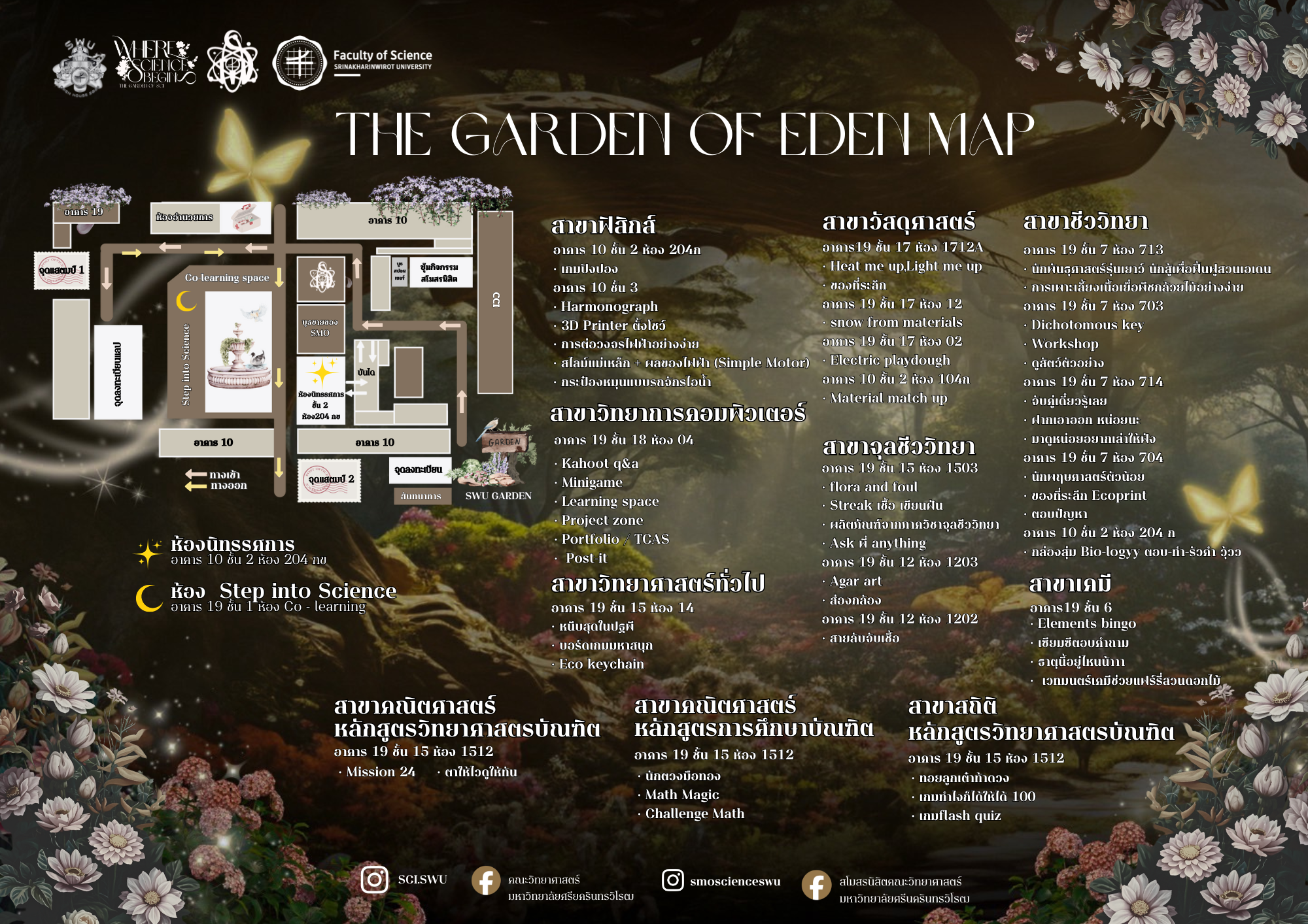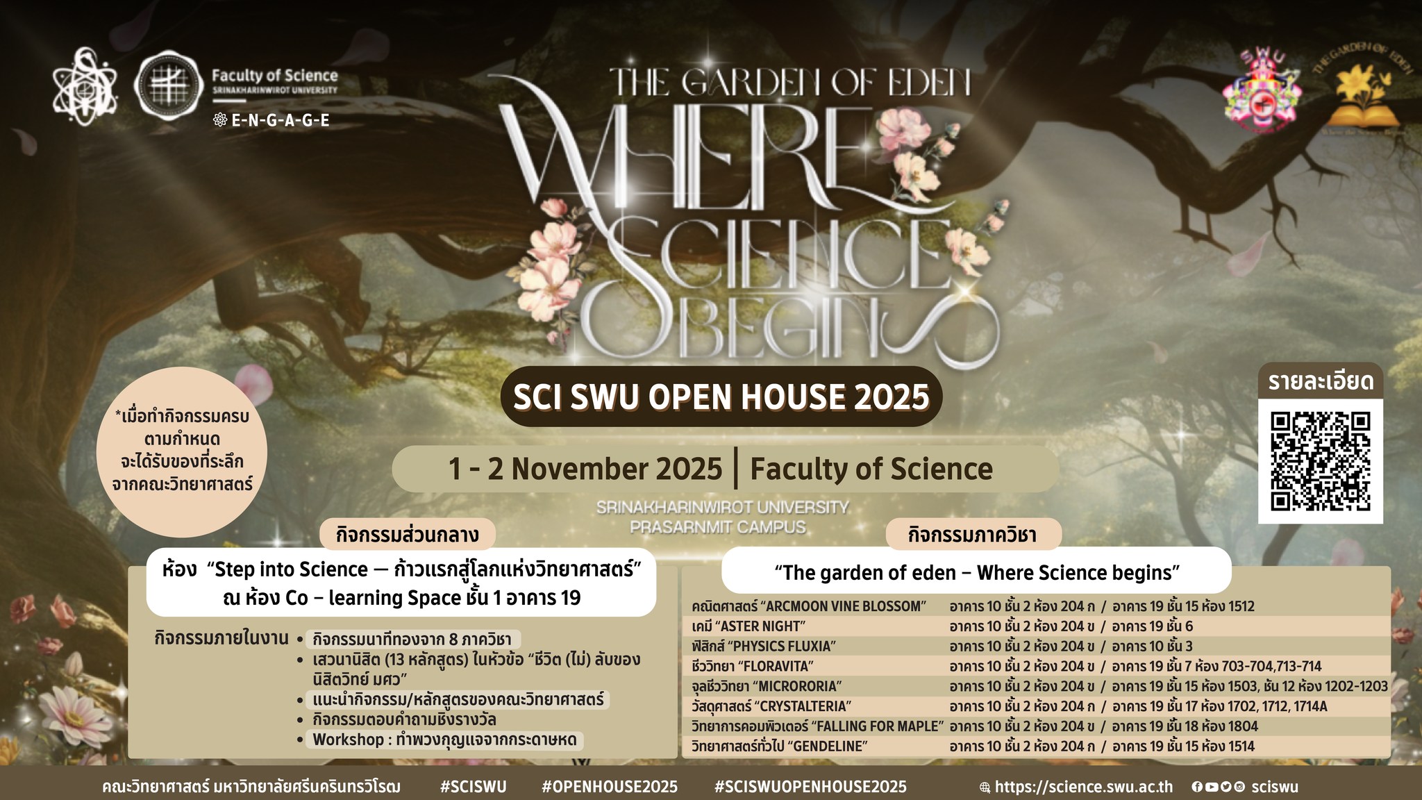 Gensci / Friday, October 31, 2025 / Categories: ข่าวประชาสัมพันธ์ภาควิชา, ข่าวประชาสัมพันธ์คณะ ขอเชิญผู้สนใจ เข้าร่วมงานเปิดบ้าน "SCI SWU Open House 2025" ในธีม “สวนเอเดนแห่งวิทยาศาสตร์” ขอเชิญ ผู้บริหาร คณาจารย์ บุคลากร นิสิต นักเรียน ผู้ปกครอง คุณครู และผู้สนใจ เข้าร่วมงานเปิดบ้าน “SCI SWU Open House 2025” ในธีม “สวนเอเดนแห่งวิทยาศาสตร์” The Garden of Eden: Where Science Begins 🗓️ ในวันเสาร์ที่ 1 และวันอาทิตย์ที่ 2 พฤศจิกายน 2568 เวลา 07.00 – 16.00 น. 📍 ณ อาคาร 10 และ 19 คณะวิทยาศาสตร์ กิจกรรมภายในงาน 📍 กิจกรรมส่วนกลาง ณ ห้อง SCI Co-Learning Space ชั้น 1 อาคาร 19 คณะวิทยาศาสตร์ - กิจกรรมนาทีทองจาก 8 ภาควิชา - เสวนานิสิต จาก 13 หลักสูตร - แนะนำกิจกรรม/หลักสูตรของคณะ - กิจกรรมตอบคำถามชิงรางวัล - Workshop : ทำพวงกุญแจจากกระดาษหด 📍 กิจกรรมภาควิชา ณ อาคาร 10, 19 คณะวิทยาศาสตร์ - Science Show จากภาควิชาต่าง ๆ - เกมส์และกิจกรรมทางวิทยาศาสตร์ - การทดลองของแต่ละสาขาวิชา 📍 หมายเหตุ : *เมื่อทำกิจกรรมครบตามกำหนด จะได้รับของทีระลึกจากคณะวิทยาศาสตร์ ดูภาพเพิ่มเติม Previous Article ภาควิชาวิทยาศาสตร์ทั่วไป ขอเชิญร่วมกิจกรรม เรียนรู้เคล็ดลับการทำอาหารพร้อมต่อยอดสู่อาชีพในอนาคตไปกับชาร์ป Print 18 Rate this article: No rating Please login or register to post comments.