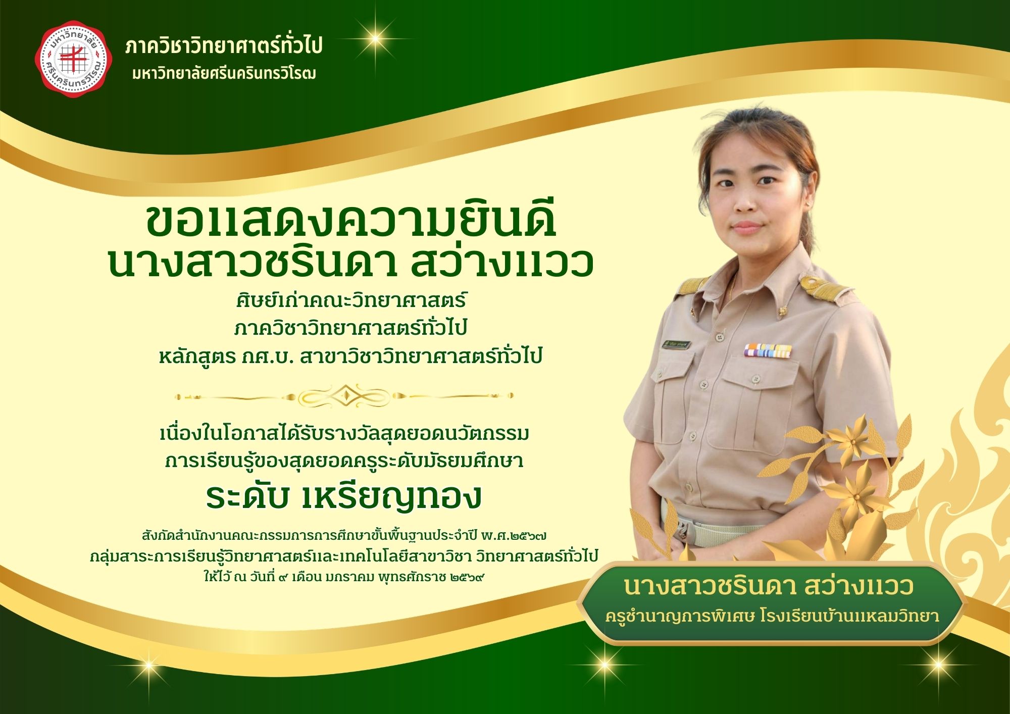 Gensci / Wednesday, January 14, 2026 / Categories: ข่าวประชาสัมพันธ์ภาควิชา, ข่าวประชาสัมพันธ์คณะ ภาควิชาวิทยาศาสตร์ทั่วไปขอแสดงความยินดีกับ นางสาวชรินดา สว่างแวว เนื่องในโอกาสได้รับรางวัลสุดยอดนวัตกรรม การเรียนรู้ของสุดยอดครูระดับมัธยมศึกษา ระดับเหรียญทอง ภาควิชาวิทยาศาสตร์ทั่วไป ขอแสดงความยินดี กับศิษย์เก่า หลักสูตร กศ.บ.วิทยาศาสตร์ทั่วไป นางสาวชรินดา สว่างแวว ครูชำนาญการพิเศษ โรงเรียนบ้านแหลมวิทยา เนื่องในโอกาสได้รับรางวัลสุดยอดนวัตกรรม การเรียนรู้ของสุดยอดครูระดับมัธยมศึกษา ระดับ เหรียญทอง สังกัดสำนักงานคณะกรรมการการศึกษาขั้นพื้นฐาน ประจำปี พ.ศ.๒๕๖๗ กลุ่มสาระการเรียนรู้วิทยาศาสตร์และเทคโนโลยี สาขาวิชา วิทยาศาสตร์ทั่วไป ให้ไว้ ณ วันที่ ๙ เดือน มกราคม พุทธศักราช ๒๕๖๗ Previous Article ภาควิชาวิทยาศาสตร์ทั่วไป ขอแสดงความยินดี กับ นางสาวอุทัยรัตน์ ผาสุข เนื่องในโอกาส ได้รับรางวัล "คุรุชนคนคุณธรรม" ประเภทครูผู้สอน ระดับดีเยี่ยม Next Article ภาควิชาวิทยาศาสตร์ทั่วไป ขอแสดงความยินดี กับ นายจักรพันธ์ วงษ์ไทร นิสิตหลักสูตร กศ.บ.วิทยาศาสตร์ทั่วไป ชั้นปีที่4 ได้รับ รางวัลชนะเลิศ พร้อมเงินรางวัล 5,000 บาท Print 80 Rate this article: No rating Please login or register to post comments.