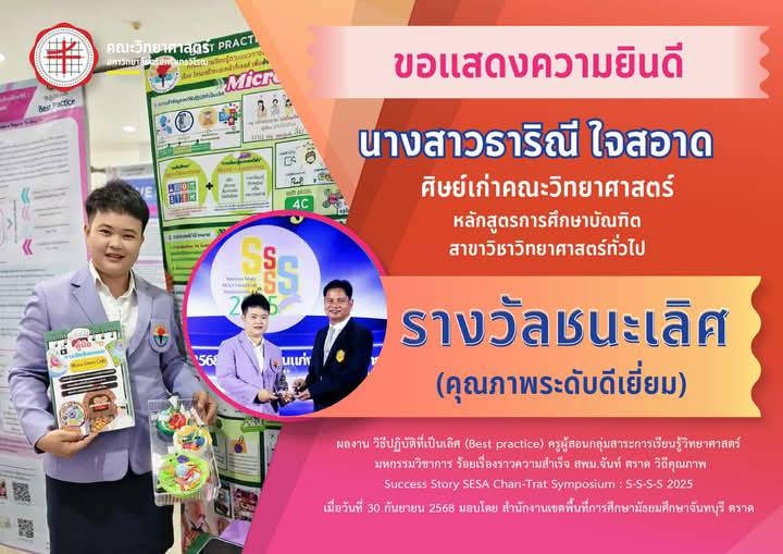 Gensci / Thursday, October 2, 2025 / Categories: ข่าวประชาสัมพันธ์ภาควิชา, ข่าวประชาสัมพันธ์คณะ ภาควิชาวิทยาศาสตร์ทั่วไปขอแสดงความยินดีกับ นางสาวธาริณี ใจสอาด ได้รับรางวัลชนะเลิศ (คุณภาพระดับดีเยี่ยม) Best of the Best การคัดเลือกผลงาน วิธีปฏิบัติที่เป็นเลิศ (Best practice) ภาควิชาวิทยาศาสตร์ทั่วไปขอแสดงความยินดีกับ นางสาวธาริณี ใจสอาด นิสิตคณะวิทยาศาสตร์ เอกวิทยาศาสตร์ทั่วไป กศ.บ. 5 ปี รหัส 53102011018 ได้รับรางวัลชนะเลิศ (คุณภาพระดับดีเยี่ยม) Best of the Best การคัดเลือกผลงาน วิธีปฏิบัติที่เป็นเลิศ (Best practice) ครูผู้สอนกลุ่มสาระการเรียนรู้วิทยาศาสตร์ มหกรรมวิชาการ ร้อยเรื่องราวความสำเร็จ สพม.จันท์ ตราด วิถีคุณภาพ Success Story SESA Chan-Trat Symposium : S-S-S-S 2025 หน่วยงานที่มอบ สำนักงานเขตพื้นที่การศึกษามัธยมศึกษาจันทบุรี ตราด แข่งขันวันที่ 2 กันยายน 2568 ประกาศและรับมอบรางวัลวันที่ 30 กันยายน 2568 Previous Article การลงทะเบียนเข้าร่วมงาน SWU Open House 2025 ได้เริ่มขึ้นแล้ว ! SWU Open House 2025 จะจัดขึ้น 1-2 พฤศจิกายน 2568 ณ มหาวิทยาลัยศรีนครินทรวิโรฒ ประสานมิตร Next Article ภาควิชาวิทยาศาสตร์ทั่วไปขอแสดงความยินดีกับ นายสันติภพ ฝึกฝนจิตต์ ได้รับรางวัลชนะเลิศ (คุณภาพระดับดีเยี่ยม) Best of the Best การคัดเลือกผลงาน วิธีปฏิบัติที่เป็นเลิศ (Best practice) ดิจิทัล AI Print 127 Rate this article: 4.0 Please login or register to post comments.
