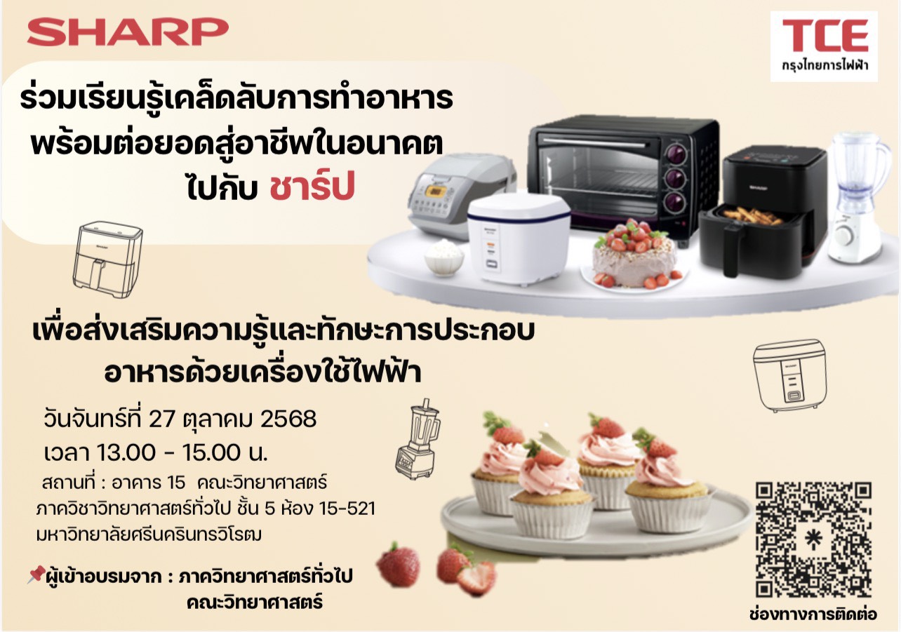 Gensci / Tuesday, October 21, 2025 / Categories: ข่าวประชาสัมพันธ์ภาควิชา ภาควิชาวิทยาศาสตร์ทั่วไป ขอเชิญร่วมกิจกรรม เรียนรู้เคล็ดลับการทำอาหารพร้อมต่อยอดสู่อาชีพในอนาคตไปกับชาร์ป ร่วมเรียนรู้เคล็ดลับการทําอาหารพร้อมต่อยอดสู่อาชีพในอนาคตไปกับชาร์ป เพื่อส่งเสริมความรู้และทักษะการประกอบอาหารด้วยเครืองใช้ไฟฟ้า กิจกรรมสำหรับนิสิตชั้นปีที่ 3 หลักสูตรกศ.บ วิทยาศาสตร์ทั่วไป ในวันจันทร์ที่ 27 ตุลาคม 2568 เวลา 13.00 – 15.00 น. สถานที่: อาคาร 15 ชั้น 5 ห้อง 15-521 ภาควิชาวิทยาศาสตร์ทั่วไป คณะวิทยาศาสตร์ มหาวิทยาลัยศรีนครินทรวิโรฒ Previous Article ภาควิชาวิทยาศาสตร์ทั่วไปขอแสดงความยินดีกับนาย วรสิทธิ์ ญวนพลอย เนื่องในโอกาสย้ายมาดำรงตำแหน่ง ผู้อำนวยการโรงเรียนบางมดวิทยา “สีสุกหวาดจวนอุปถัมภ์” สำนักงานเขตพื้นที่การศึกษามัธยมศึกษากรุงเทพมหานครเขต1 Print 3 Rate this article: No rating Please login or register to post comments.