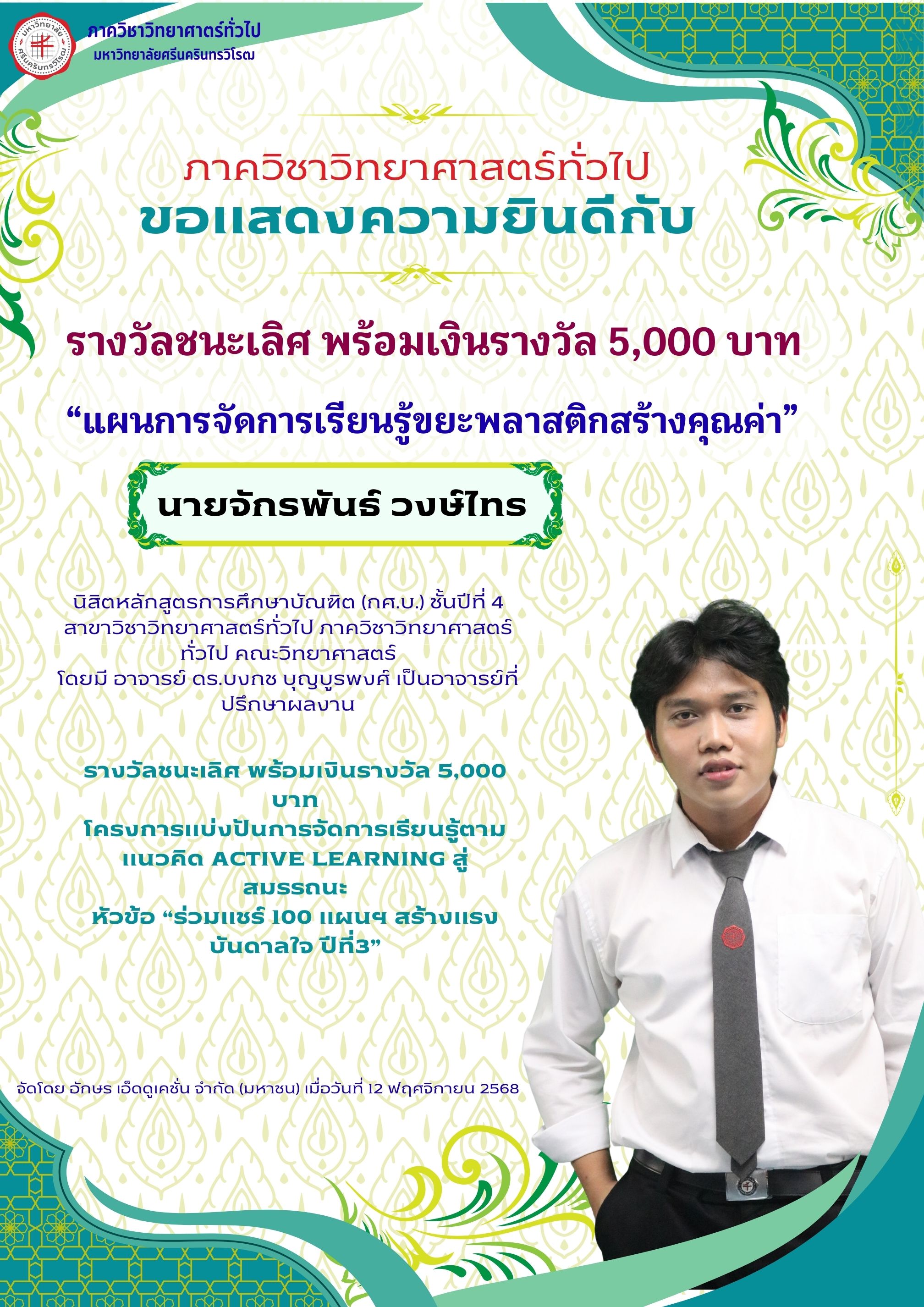 Gensci / Wednesday, March 4, 2026 / Categories: ข่าวประชาสัมพันธ์ภาควิชา, ข่าวประชาสัมพันธ์คณะ ภาควิชาวิทยาศาสตร์ทั่วไป ขอแสดงความยินดี กับ นายจักรพันธ์ วงษ์ไทร นิสิตภาควิชาวิทยาศาสตร์ทั่วไป ในโอกาสได้รับ “รางวัลชนะเลิศ” พร้อมเงินรางวัล 5,000 บาท “แผนการจัดการเรียนรู้ขยะพลาสติกสร้างคุณค่า” ภาควิชาวิทยาศาตร์ทั่วไป ขอแสดงความยินดีกับ นายจักรพันธ์ วงษ์ไทร นิสิตชั้นปีที่ 4 หลักสูตรการศึกษาบัณฑิต สาขาวิชาวิทยาศาสตร์ทั่วไป ภาควิชาวิทยาศาสตร์ทั่วไป คณะวิทยาศาสตร์ ในโอกาสได้รับ “รางวัลชนะเลิศ” พร้อมเงินรางวัล 5,000 บาท “แผนการจัดการเรียนรู้ขยะพลาสติกสร้างคุณค่า” โครงการแบ่งปันการจัดการเรียนรู้ตามแนวคิด Active learning สู่สมรรถนะ หัวข้อ “ร่วมแชร์ 100 แผนฯ สร้างแรงบันดาลใจ ปีที่ 3” โดยมี อาจารย์ ดร.บงกช บุญบูรพงศ์ เป็นอาจารย์ที่ปรึกษาผลงาน จัดโดย อักษร เอ็ดดูเคชั่น จำกัด (มหาชน) เมื่อวันที่ 12 พฤศจิกายน 2568 Previous Article ภาควิชาวิทยาศาสตร์ทั่วไป ได้จัดกิจกรรมการเรียนการสอนในรายวิชา SC 475 SPECIAL PROBLEMS IN SCIENCE II สำหรับนิสิตระดับปริญญาตรี หลักสูตรการศึกษาบัณฑิต (กศ.บ.) สาขาวิชาวิทยาศาสตร์ทั่วไป ชั้นปีที่ 4 Next Article ภาควิชาวิทยาศาสตร์ทั่วไป ขอแสดงความยินดี กับ นายวิชชา ยศอ่อน ศึกษานิเทศก์ชำนาญการพิเศษ ศิษย์เก่า กศ.บ.วิทยาศาสตร์ทั่วไป คณะวิทยาศาสตร์ ได้รับรางวัลศึกษานิเทศก์ดีเด่น Print 31 Rate this article: No rating Please login or register to post comments.