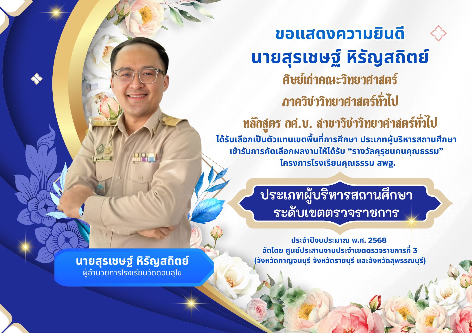 Gensci / Wednesday, November 12, 2025 / Categories: ข่าวประชาสัมพันธ์ภาควิชา, ข่าวประชาสัมพันธ์คณะ ภาควิชาวิทยาศาสตร์ทั่วไป ขอแสดงความยินดี กับ นายสุรเชษฐ์ หิรัญสถิตย์ รับการคัดเลือกผลงานให้ได้รับ "รางวัลคุรุชนคนคุณธรรม" ประเภทผู้บริหารสถานศึกษา ระดับเขตตรวจราชการ ได้รับเลือกเป็นตัวแทนเขตพื้นที่การศึกษา ประเภทผู้บริหารสถานศึกษา เข้ารับการคัดเลือกผลงานให้ได้รับ "รางวัลคุรุชนคนคุณธรรม" โครงการโรงเรียนคุณธรรม สพฐ. ภาควิชาวิทยาศาสตร์ทั่วไป ขอแสดงความยินดี กับ นายสุรเชษฐ์ หิรัญสถิตย์ ผู้อำนวยการโรงเรียนวัดดอนสุโข ได้รับเลือกเป็นตัวแทนเขตพื้นที่การศึกษา ประเภทผู้บริหารสถานศึกษา เข้ารับการคัดเลือกผลงานให้ได้รับ "รางวัลคุรุชนคนคุณธรรม" โครงการโรงเรียนคุณธรรม สพฐ. ประเภทผู้บริหารสถานศึกษา ระดับเขตตรวจราชการ ประจำปีงบประมาณ พ.ศ.2568 จัดโดย ศูนย์ประสานงานประจำเขตตรวจราชการที่ 3 (จังหวัดกาญจนบุรี จังหวัดราชบุรี และจังหวัดสุพรรณบุรี) ระดับเขตพื้นที่การศึกษา ประจำปี พ.ศ. 2568 Previous Article ขอเชิญผู้สนใจ เข้าร่วมงานเปิดบ้าน "SCI SWU Open House 2025" ในธีม “สวนเอเดนแห่งวิทยาศาสตร์” Next Article ภาควิชาวิทยาศาสตร์ทั่วไป ขอแสดงความยินดีกับ นางสาวอุทัยรัตน์ ผาสุข ครูโรงเรียนวัดกลาง เนื่องในโอกาสได้รับรางวัล “ครูดีศรี สกสค. จังหวัดสิงห์บุรี” Print 4 Rate this article: No rating Please login or register to post comments.