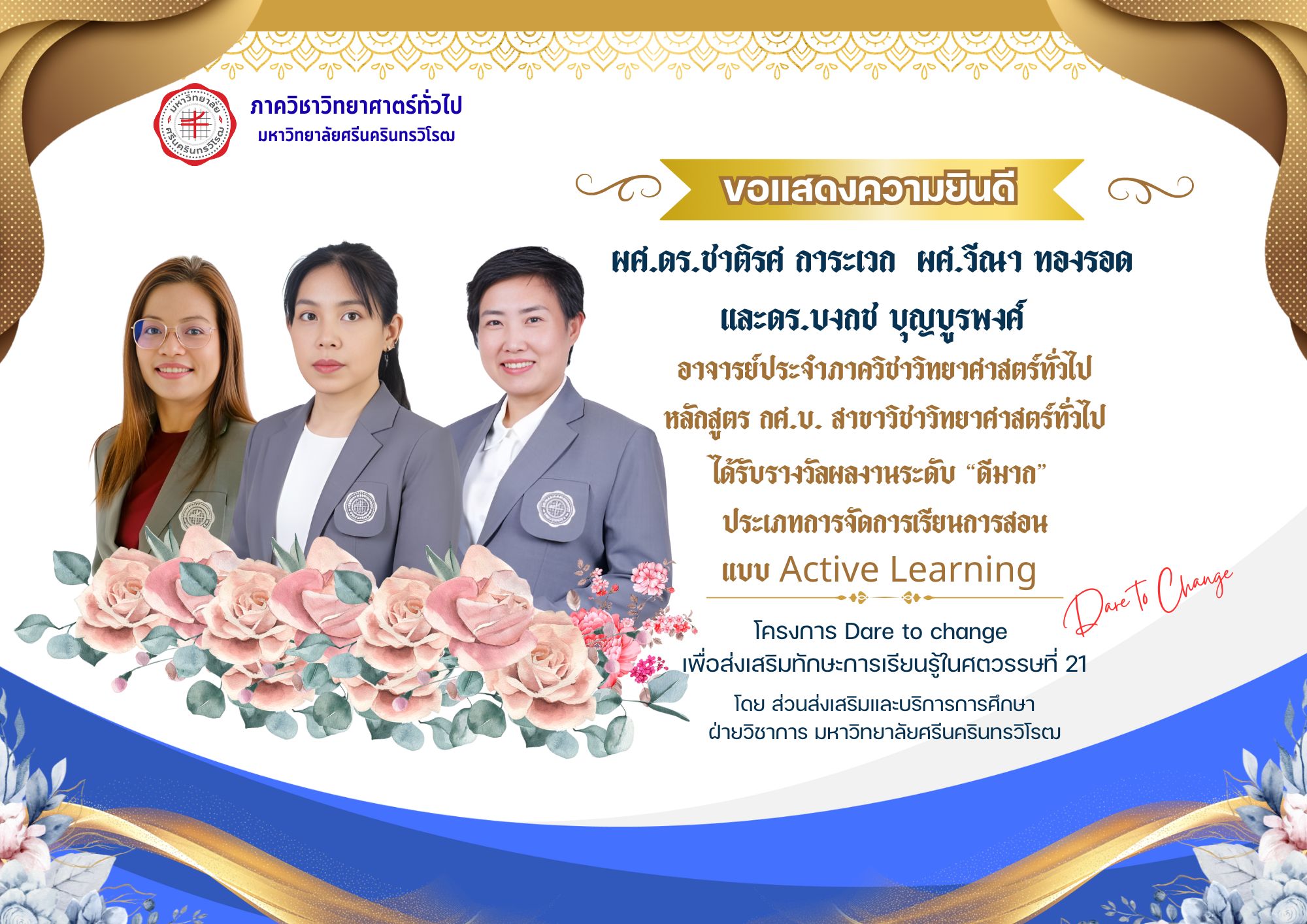 Gensci / Wednesday, November 12, 2025 / Categories: ข่าวประชาสัมพันธ์ภาควิชา ภาควิชาวิทยาศาสตร์ทั่วไป ขอแสดงความยินดี กับ ผศ.ดร.ชาติรส การะเวก ผศ.วีณา ทองรอด และดร.บงกช บุญบูรพงศ์ อาจารย์ประจำภาควิชาวิทยาศาสตร์ทั่วไป ได้รับรางวัลผลงานระดับ “ดีมาก” ภาควิชาวิทยาศาสตร์ทั่วไป ขอแสดงความยินดี กับ ผศ.ดร.ชาติรส การะเวก ผศ.วีณา ทองรอด และดร.บงกช บุญบูรพงศ์ อาจารย์ประจำภาควิชาวิทยาศาสตร์ทั่วไป ได้รับรางวัลผลงานระดับ “ดีมาก” ประเภทการจัดการเรียนการสอนแบบ Active Learning ในโครงการ Dare to change โดย ส่วนส่งเสริมและบริการการศึกษา ฝ่ายวิชาการ มหาวิทยาลัยศรีนครินทรวิโรฒ Previous Article ภาควิชาวิทยาศาสตร์ทั่วไป ขอแสดงความยินดีกับ นางสาวอุทัยรัตน์ ผาสุข ครูโรงเรียนวัดกลาง เนื่องในโอกาสได้รับรางวัล “รองชนะเลิศอันดับ 2” Print 1 Rate this article: No rating Please login or register to post comments.