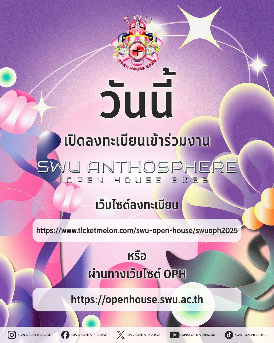 Gensci / Tuesday, September 30, 2025 / Categories: ข่าวประชาสัมพันธ์ภาควิชา, ข่าวประชาสัมพันธ์คณะ การลงทะเบียนเข้าร่วมงาน SWU Open House 2025 ได้เริ่มขึ้นแล้ว ! SWU Open House 2025 จะจัดขึ้น 1-2 พฤศจิกายน 2568 ณ มหาวิทยาลัยศรีนครินทรวิโรฒ ประสานมิตร ณ บัดนี้ SWU ANTHOSPHERE “ สวนแห่งการเรียนรู้ ” ที่เต็มไปด้วยกลิ่นหอมของดอกไม้แห่งแรงบันดาลใจ ที่เป็นตัวแทนของทั้ง 20 คณะ/วิทยาลัย ให้เหล่าผีเสื้อตัวน้อย ได้เลือกสรรดอกไม้แห่งความฝันของตัวเอง เมื่อเสร็จสิ้นการลงทะเบียนแล้ว อย่าลืมตรวจสอบข้อมูลให้ครบถ้วน เพื่อจะได้โบยบินสู่สวนแห่งแห่งการเรียนรู้อย่างมั่นใจ : ที่สำคัญ… งานนี้ ไม่จำกัดจำนวนผู้เข้าร่วม ทุกคนคือผีเสื้อที่มีสิทธิ์ได้โบยบินสู่ดอกไม้ในฝันของตัวเอง : SWU Open House 2025 จะจัดขึ้น… 1-2 พฤศจิกายน 2568 เริ่มลงทะเบียนเข้างาน ตั้งแต่เวลา 07:30 น. เป็นต้นไป ณ มหาวิทยาลัยศรีนครินทรวิโรฒ ประสานมิตร : Contact SWU OPH 2025 WEBSITE : https://openhouse.swu.ac.th IG : @swuopenhouse FB : SWU OPEN HOUSE YouTube : SWU OPEN HOUSE TIKTOK : @swuopenhouse X : @swuopenhouse : #SWUAnthosphere #SWUOpenHouse2025 #เปิดบ้านศรีนครินทรวิโรฒ #มหาวิทยาลัยศรีนครินทรวิโรฒ #มศว #SWU #TCAS69 #DEK69 Previous Article ภาควิชาวิทยาศาสตร์ทั่วไป ขอแสดงความยินดีกับ ผศ.วีณา ทองรอด ที่ได้รับการแต่งตั้งให้ดำรงตำแหน่งทางวิชาการ “ผู้ช่วยศาสตราจารย์วีณา ทองรอด” Next Article ภาควิชาวิทยาศาสตร์ทั่วไปขอแสดงความยินดีกับ นางสาวธาริณี ใจสอาด ได้รับรางวัลชนะเลิศ (คุณภาพระดับดีเยี่ยม) Best of the Best การคัดเลือกผลงาน วิธีปฏิบัติที่เป็นเลิศ (Best practice) Print 5 Rate this article: No rating Please login or register to post comments.