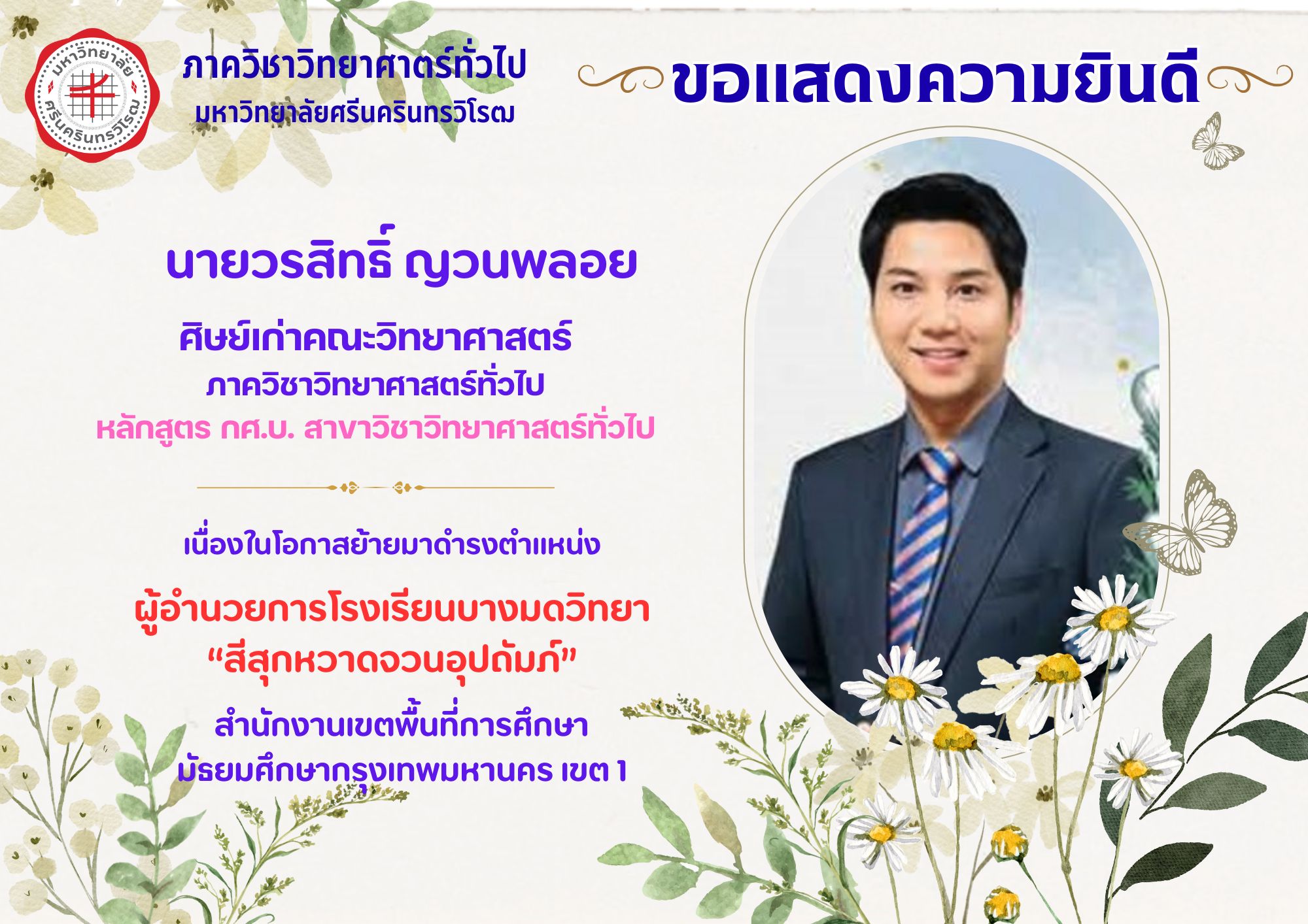 Gensci / Tuesday, October 21, 2025 / Categories: ข่าวประชาสัมพันธ์ภาควิชา, ข่าวประชาสัมพันธ์คณะ ภาควิชาวิทยาศาสตร์ทั่วไปขอแสดงความยินดีกับนาย วรสิทธิ์ ญวนพลอย เนื่องในโอกาสย้ายมาดำรงตำแหน่ง ผู้อำนวยการโรงเรียนบางมดวิทยา “สีสุกหวาดจวนอุปถัมภ์” สำนักงานเขตพื้นที่การศึกษามัธยมศึกษากรุงเทพมหานครเขต1 ภาควิชาวิทยาศาสตร์ทั่วไปขอแสดงความยินดีกับ นาย วรสิทธิ์ ญวนพลอย ศิษย์เก่าหลักสูตร กศ.บ.วิทยาศาสตร์ทั่วไป เนื่องในโอกาสย้ายมาดำรงตำแหน่ง ผู้อำนวยการโรงเรียนบางมดวิทยา “สีสุกหวาดจวนอุปถัมภ์” สำนักงานเขตพื้นที่การศึกษามัธยมศึกษากรุงเทพมหานคร เขต 1 Previous Article พิธีพระราชทานปริญญาบัตร มหาวิทยาลัยศรีนครินทรวิโรฒ ประจำปีการศึกษา 2567 Next Article ภาควิชาวิทยาศาสตร์ทั่วไป ขอเชิญร่วมกิจกรรม เรียนรู้เคล็ดลับการทำอาหารพร้อมต่อยอดสู่อาชีพในอนาคตไปกับชาร์ป Print 144 Rate this article: 3.0 Please login or register to post comments.
