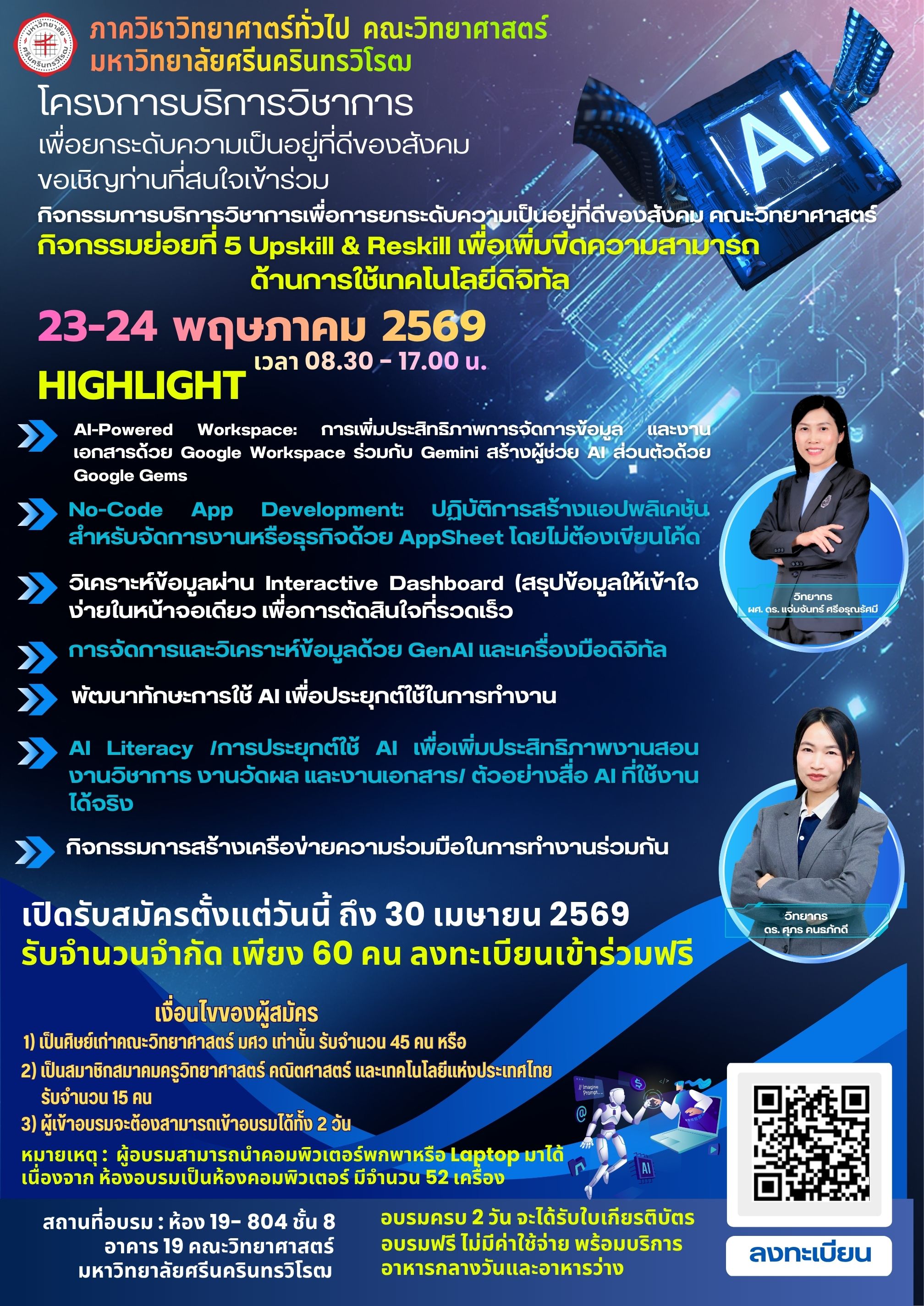 Gensci / Tuesday, April 7, 2026 / Categories: ข่าวประชาสัมพันธ์ภาควิชา, ข่าวประชาสัมพันธ์คณะ ภาควิชาวิทยาศาสตร์ทั่วไป ขอเชิญศิษย์เก่าเข้าร่วมอบรม กิจกรรมย่อยที่ 5 Upskill & Reskill เพื่อเพิ่มขีดความสามารถด้านการใช้เทคโนโลยีดิจิทัล วันที่ 23 - 24 พฤษภาคม 2569 ภาควิชาวิทยาศาสตร์ทั่วไป คณะวิทยาศาสตร์ มหาวิทยาลัยศรีนครินทรวิโรฒ ขอเชิญศิษย์เก่าเข้าร่วมอบรม โครงการบริการวิชาการเพื่อยกระดับความเป็นอยู่ที่ดีของสังคม กิจกรรม การบริการวิชาการเพื่อการยกระดับความเป็นอยู่ที่ดีของสังคม คณะวิทยาศาสตร์ กิจกรรมย่อยที่ 5 Upskill & Reskill เพื่อเพิ่มขีดความสามารถด้านการใช้เทคโนโลยีดิจิทัล วันที่ 23 - 24 พฤษภาคม 2569 ห้อง 19 – 804 ชั้น 8 อาคาร 19 คณะวิทยาศาสตร์ มหาวิทยาลัยศรีนครินทรวิโรฒ รับสมัคร ตั้งแต่วันนี้ จนถึง วันที่ 30 เมษายน 2569 รับจำนวนจำกัด เพียง 60 คน คุณสมบัติผู้สมัคร 1) เป็นศิษย์เก่าคณะวิทยาศาสตร์ มศว เท่านั้น รับจำนวน 45 คน หรือ 2) เป็นสมาชิกสมาคมครูวิทยาศาสตร์ คณิตศาสตร์ และเทคโนโลยีแห่งประเทศไทย รับจำนวน 15 คน อบรมฟรี ไม่มีค่าใช้จ่าย พร้อมบริการอาหารกลางวันและอาหารว่าง 👉ผู้สนใจสามารถ ลงทะเบียนได้ที่ https://forms.gle/ACUGWGSyqb7JAUYAA Previous Article ภาควิชาวิทยาศาสตร์ทั่วไป ขอแสดงความยินดี กับ ผู้ช่วยศาสตราจารย์วีณา ทองรอด ได้รับการจดทะเบียนทรัพย์สินทางปัญญา ประเภท อนุสิทธิบัตร จำนวน 2 ผลงาน Print 3 Rate this article: No rating Please login or register to post comments.