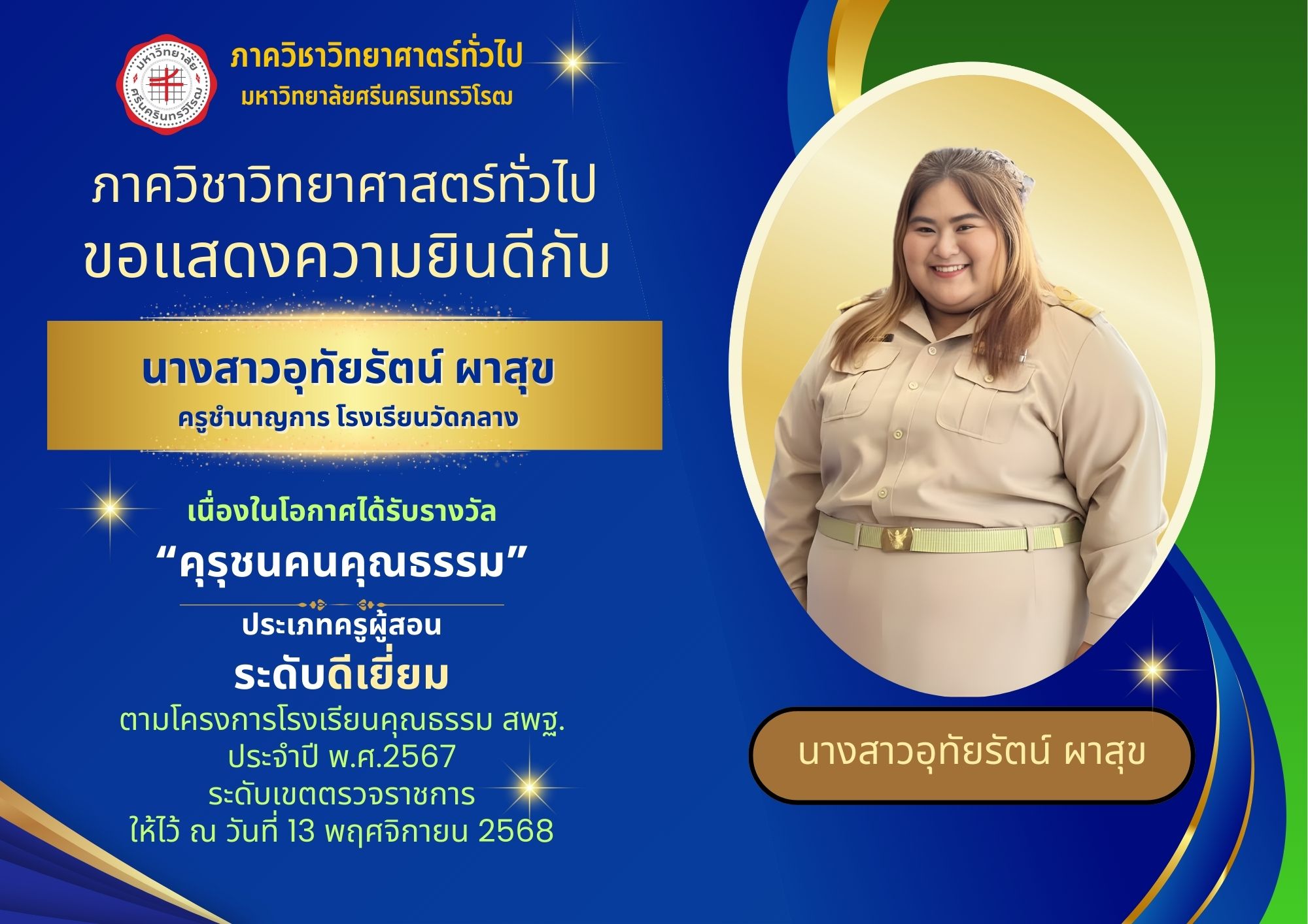 Gensci / Wednesday, January 7, 2026 / Categories: ข่าวประชาสัมพันธ์ภาควิชา, ข่าวประชาสัมพันธ์คณะ ภาควิชาวิทยาศาสตร์ทั่วไป ขอแสดงความยินดี กับ นางสาวอุทัยรัตน์ ผาสุข เนื่องในโอกาส ได้รับรางวัล "คุรุชนคนคุณธรรม" ประเภทครูผู้สอน ระดับดีเยี่ยม ภาควิชาวิทยาศาสตร์ทั่วไป ขอแสดงความยินดี กับศิษย์เก่า หลักสูตร กศ.บ.วิทยาศาสตร์ทั่วไป นางสาวอุทัยรัตน์ ผาสุข ครูชำนาญการ โรงเรียนวัดกลาง เนื่องในโอกาสได้รับรางวัล "คุรุชนคนคุณธรรม" ประเภทครูผู้สอน ระดับดีเยี่ยม ตามโครงการโรงเรียนคุณธรรม สพฐ. ประจำปี 2567 ระดับเขตตรวจราชการ ให้ไว้ ณ วันที่ 13 พฤศจิกายน 2568 Previous Article ภาควิชาวิทยาศาสตร์ทั่วไป ขอแสดงความยินดี กับ นางสาวอุทัยรัตน์ ผาสุข เนื่องในโอกาส ได้รับรางวัล "นวัตกรรมสร้างสรรค์คนดี" ระดับดีเยี่ยม Print 13 Rate this article: No rating Please login or register to post comments.
