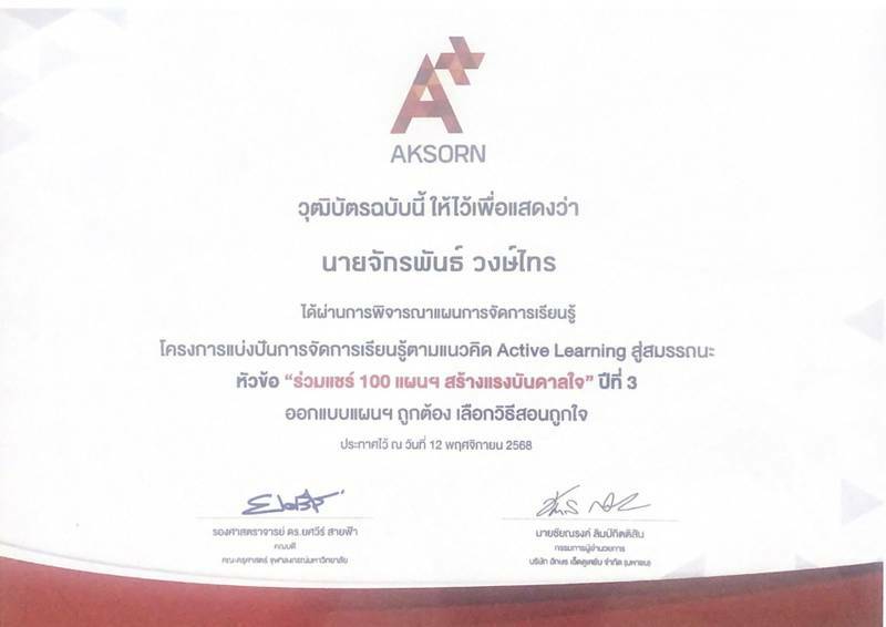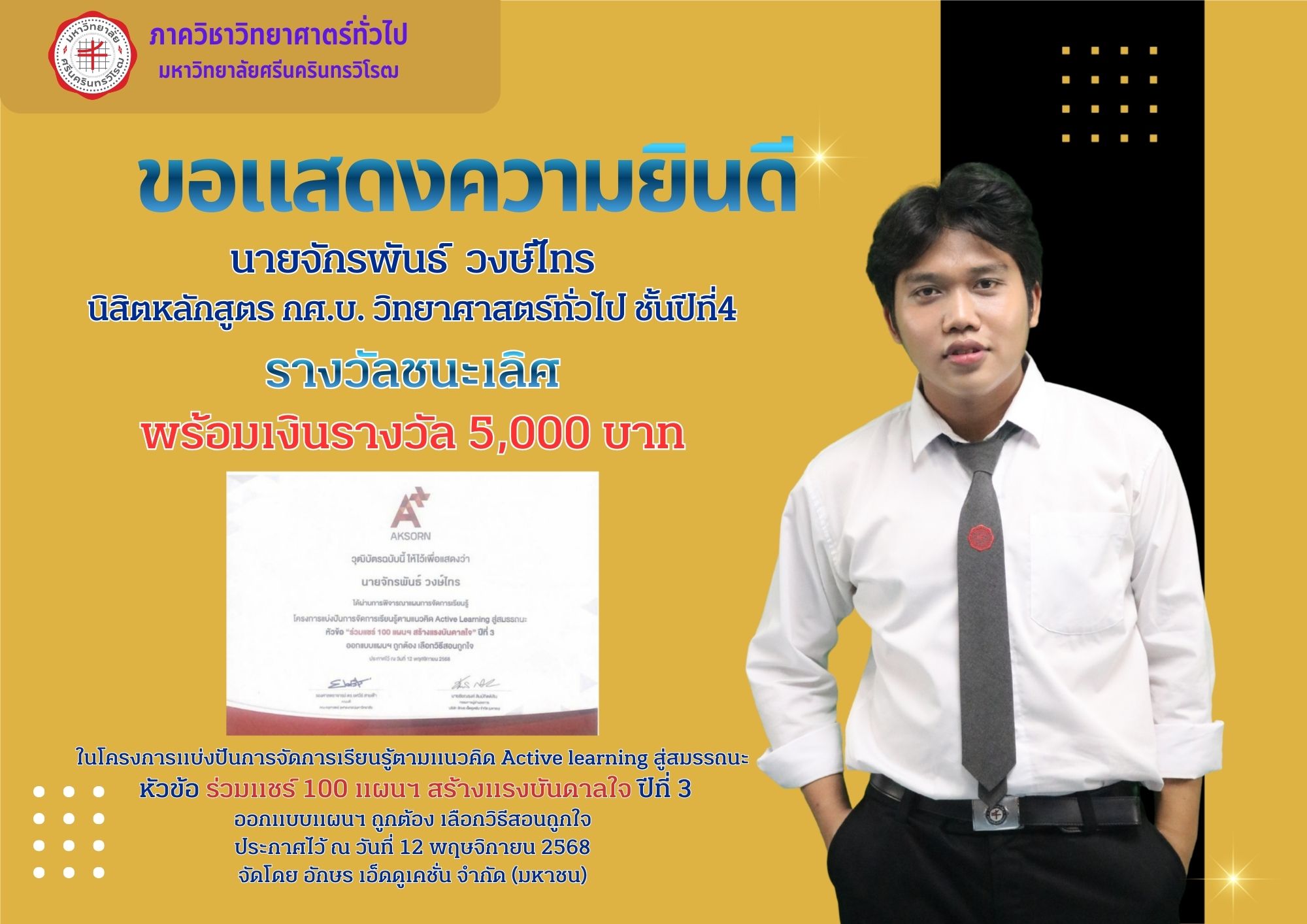 Gensci / Thursday, January 29, 2026 / Categories: ข่าวประชาสัมพันธ์ภาควิชา, ข่าวประชาสัมพันธ์คณะ ภาควิชาวิทยาศาสตร์ทั่วไป ขอแสดงความยินดี กับ นายจักรพันธ์ วงษ์ไทร นิสิตหลักสูตร กศ.บ.วิทยาศาสตร์ทั่วไป ชั้นปีที่4 ได้รับ รางวัลชนะเลิศ พร้อมเงินรางวัล 5,000 บาท ภาควิชาวิทยาศาสตร์ทั่วไป ขอแสดงความยินดี นายจักรพันธ์ วงษ์ไทร นิสิตหลักสูตร กศ.บ. วิทยาศาสตร์ทั่วไป ชั้นปีที่4 ได้รับรางวัลชนะเลิศ พร้อมเงินรางวัล 5,000 บาท ในโครงการแบ่งปันการจัดการเรียนรู้ตามแนวคิด Active learning สู่สมรรถนะ หัวข้อ ร่วมแชร์ 100 แผนฯ สร้างแรงบันดาลใจ ปีที่ 3 ออกแบบแผนฯ ถูกต้อง เลือกวิธีสอนถูกใจ ประกาศไว้ ณ วันที่ 12 พฤษจิกายน 2568 จัดโดย อักษร เอ็ดดูเคชั่น จำกัด (มหาชน) Previous Article ภาควิชาวิทยาศาสตร์ทั่วไปขอแสดงความยินดีกับ นางสาวชรินดา สว่างแวว เนื่องในโอกาสได้รับรางวัลสุดยอดนวัตกรรม การเรียนรู้ของสุดยอดครูระดับมัธยมศึกษา ระดับเหรียญทอง Next Article ภาควิชาวิทยาศาสตร์ทั่วไป ขอแสดงความยินดี กับ นางสาวทาริกา มีบุตร เนื่องในโอกาสได้รับรางวัลชนะเลิศ พร้อมเงินรางวัล 5,000 บาท Print 17 Rate this article: No rating Please login or register to post comments.